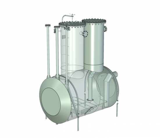 Емкости подземные конструктивно представляют собой полый цельносварной сосуд, работающий под давлением не выше 0,07 МПа, объемом до 200 м3, состоящий из металлического цилиндра и конических днищ. Для технологического обслуживания на верхней стороне обечайки, как правило, устанавливают два люка: один для слива хранимого продукта с помощью насоса, второй – для получения доступа внутрь для профилактического осмотра, технологического обслуживания и ремонта (очистка, продувка, промывка).